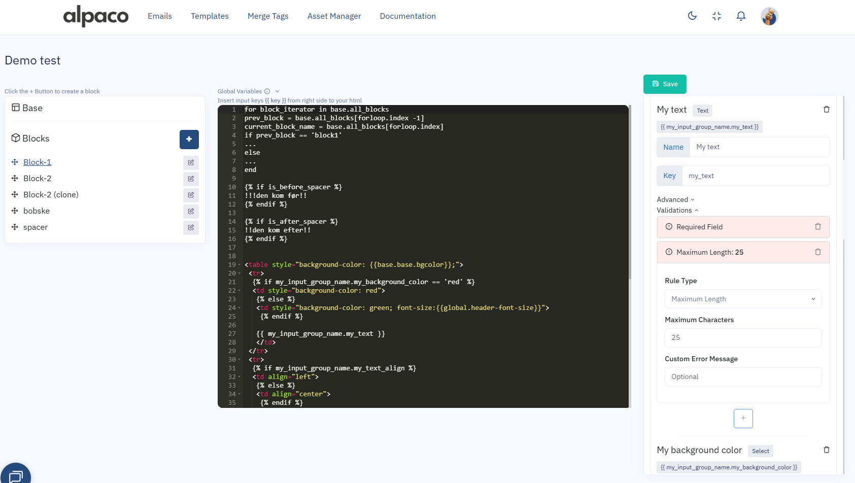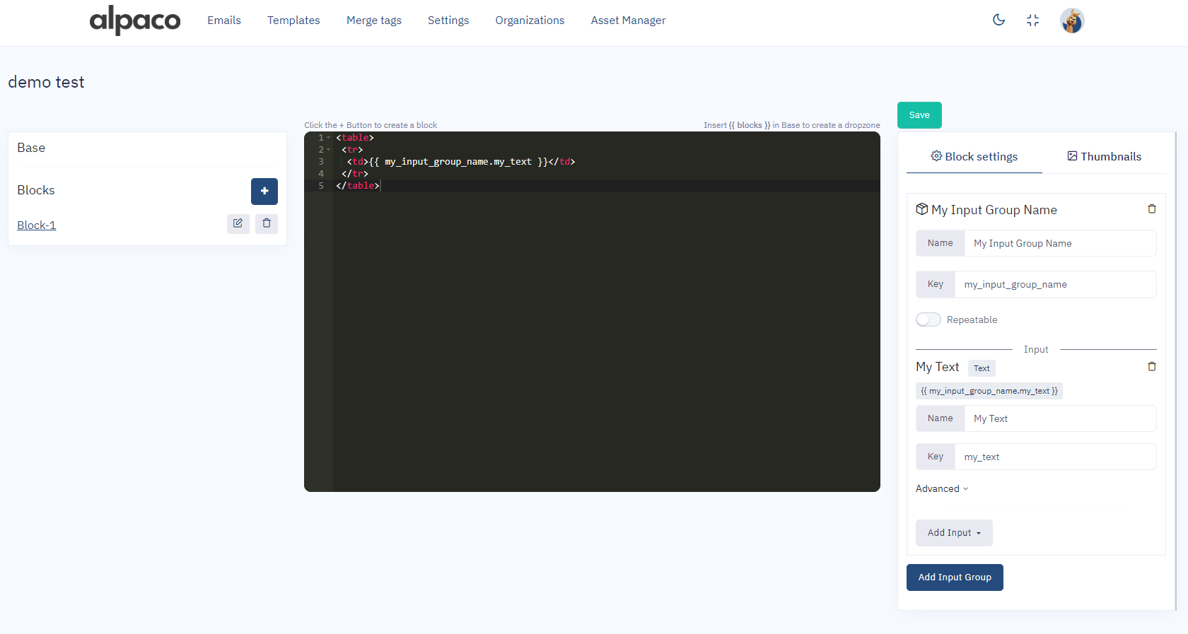Simply open up your [Base](https://documentation.alpaco.email/template/base) or [Block](https://documentation.alpaco.email/template/blocks), depending on where you want your input, navigate to the Right panel, click the button called "**Add input**" and select your input type from the dropdown.\