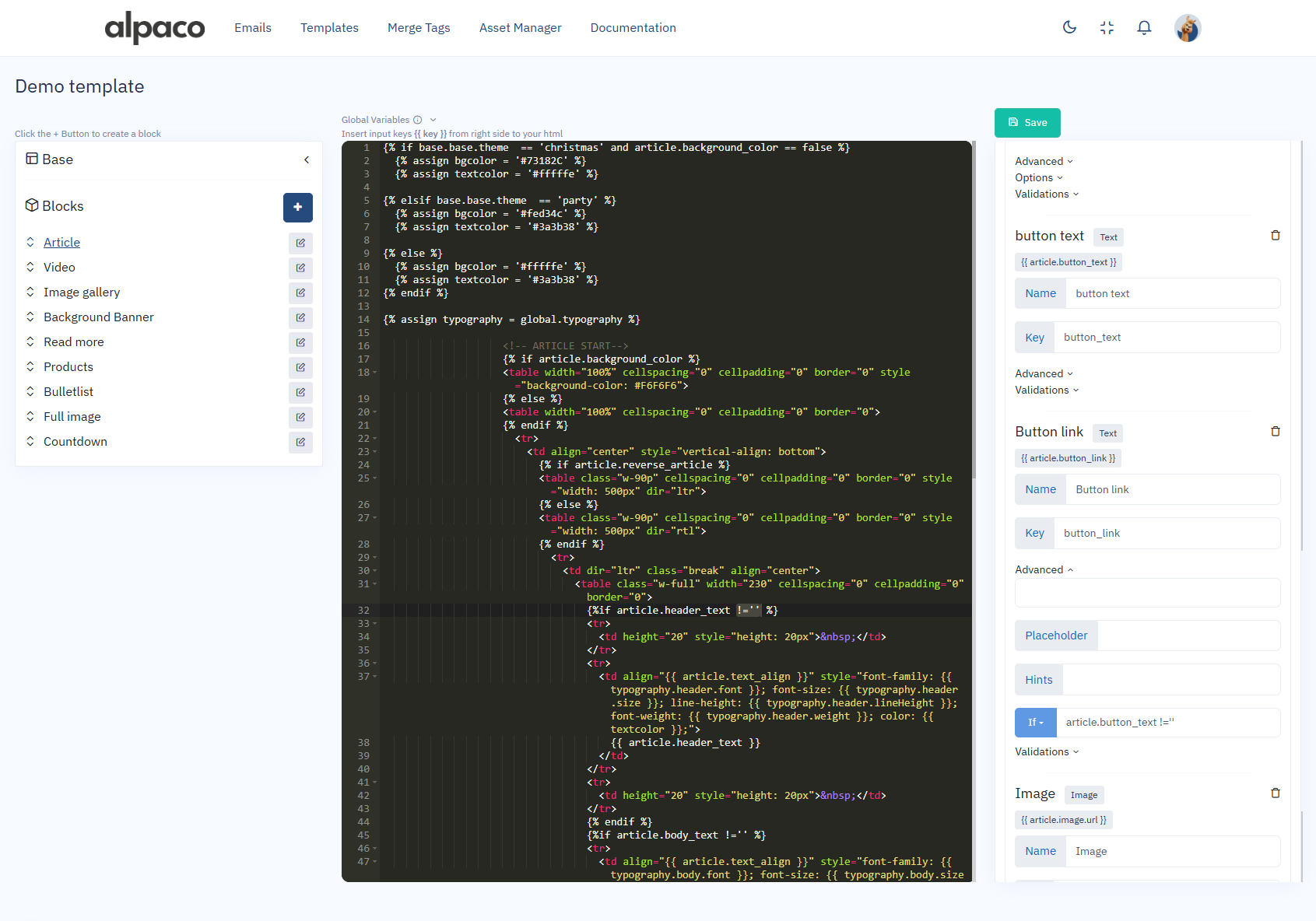 That's where the **if/unless** **field** come in handy on Inputs. You'll be able to hide or show any input types by typing in a liquid condition in accompanying if/unless field. The liquid condition could be coming either internally from the [Block](https://documentation.alpaco.email/template/blocks) or even from [Cross reference inputs](#cross-reference-inputs).