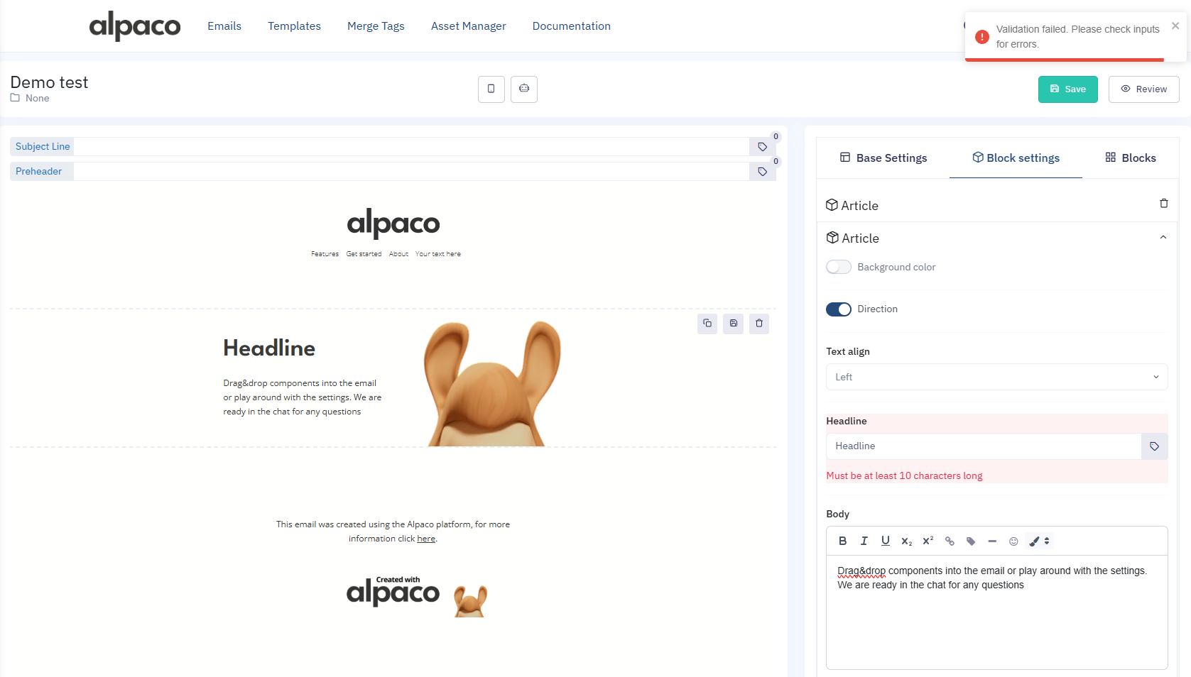 If an input is not validated in the Email Editor, the user will be informed of the error, taken to where the error is, have the error highlighted and prevented from saving the email before adhering to the specific input requirement.